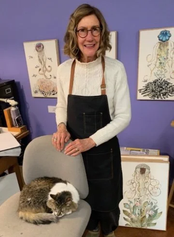 In my current series I am painting imaginative jellyfish by using a combination of alcohol inks and shellac on a white encaustic background. As the series grew, sea animals begin to appear. In the the latest works, the sea creatures are officially endangered species. This gives a nod to climate change and the effects of a warming ocean.